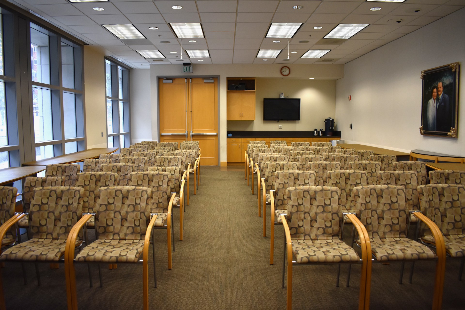 The 1st floor conference room will be set up in theatre-style with 63 chairs facing north. If any other room configuration style is requested, the user must provide their own staff personnel to change the room AND then return the room to a theatre-style configuration as soon as the meeting is completed. The default layout of the room will always be theatre-style facing north.