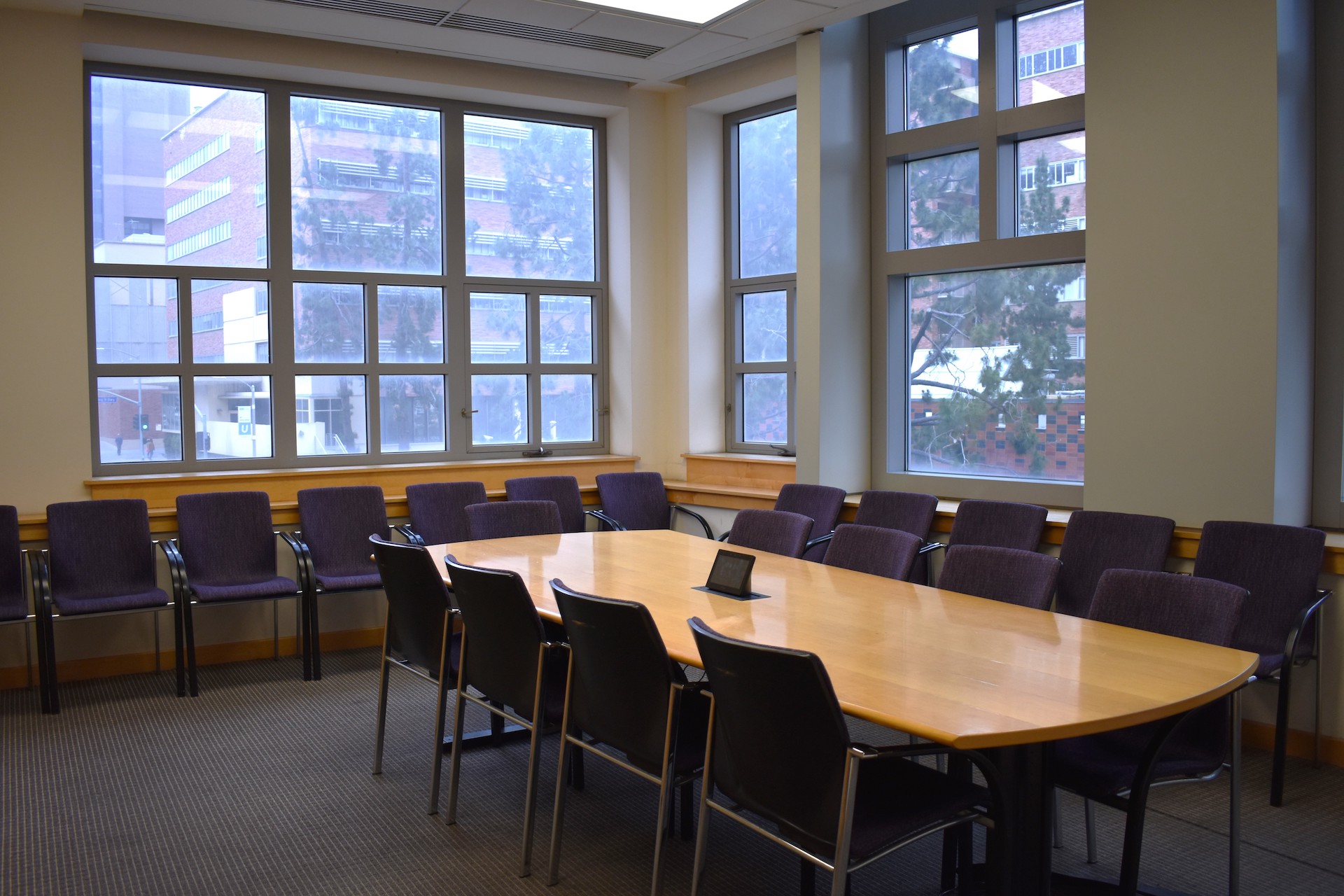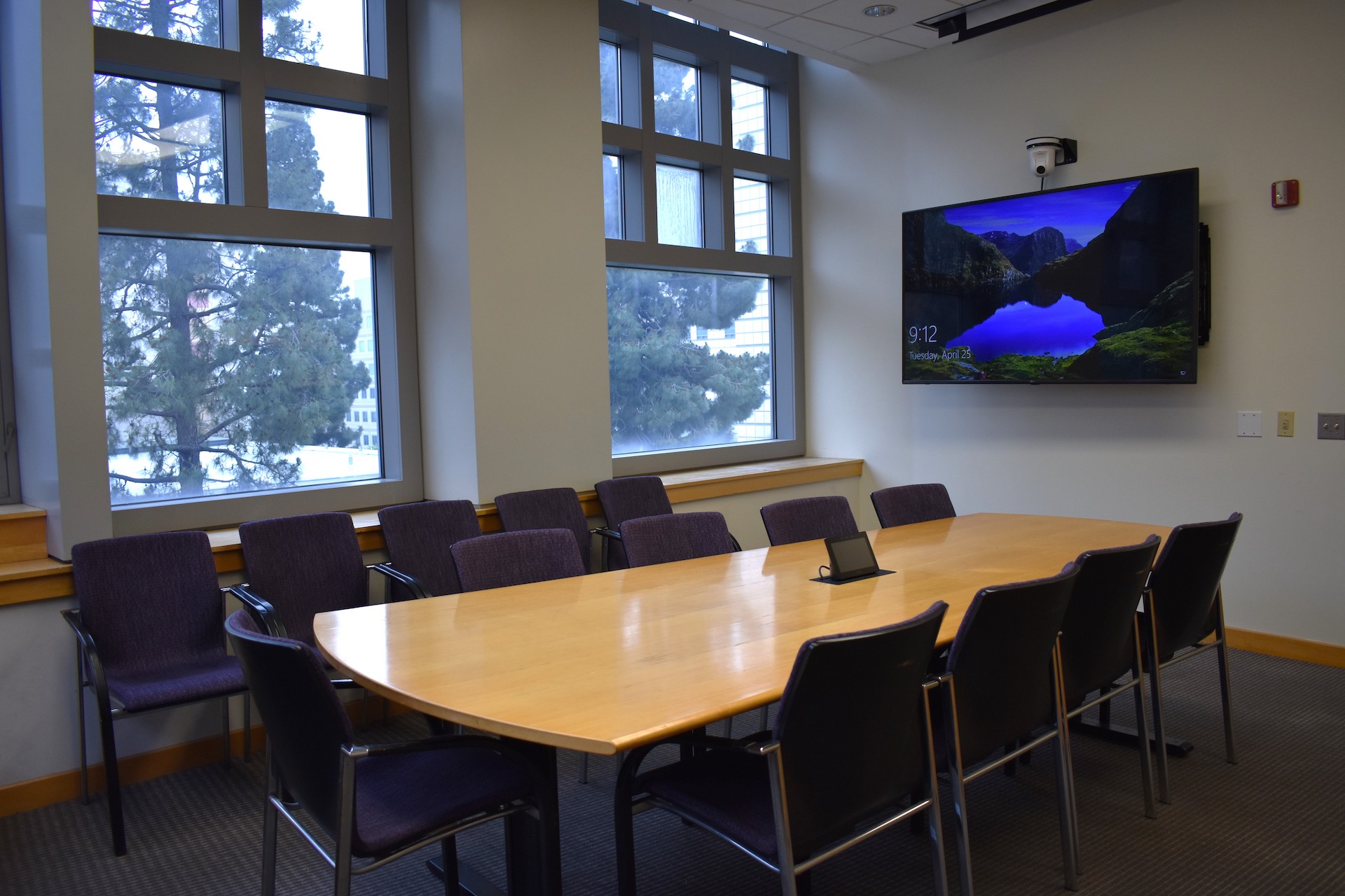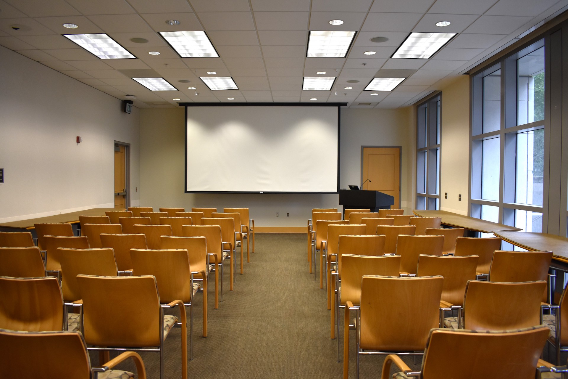 Food service is permitted in the conference room. There is a 12′ long counter in the back of the room (south end) that can be used for placing food and drinks. Sponsoring departments will be charged for spills that require carpet cleaning or other damage due to use or misuse of the room and equipment. If you know, please indicate on your reservation request who will be catering your food service, and you must arrange for pick-up of supplies immediately following your event.